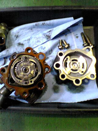 ベーン部をばらしてみると,写真では見えないけどフロントハウジングに見て,分かるほどの磨耗が・・・完全アウトです。