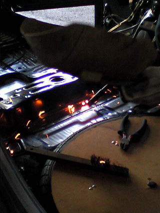 リヤシートの足元側もシール剤を剥がしてスポットを打ちます