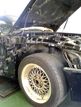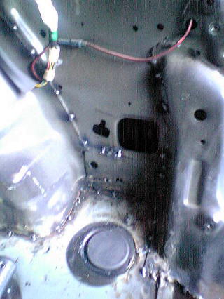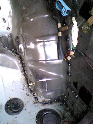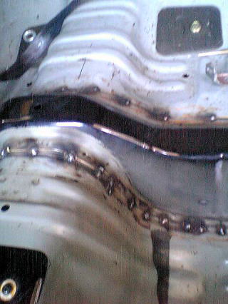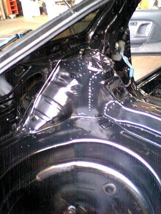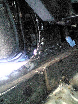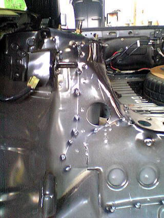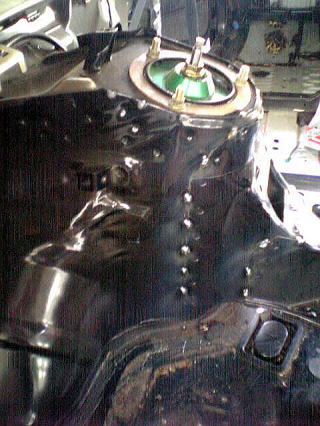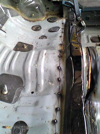 タイヤハウスとフロアーパンをつないでいるところ、ここも横方向の剛性にとてもかかわる重要なところシール剤を剥がしてスポットを打ちます。