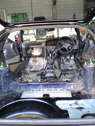 ボディー軽量化の後、車内のシール剤を剥がし、いよいよスポット増しスタートです。