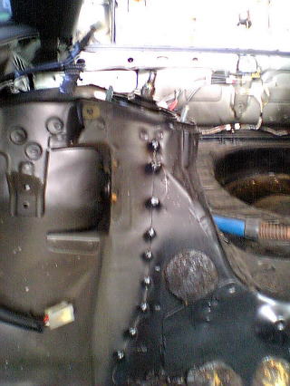 リヤのスポット増しが完成したところで運転席、助手席を外してフロアーにもスポット増し、